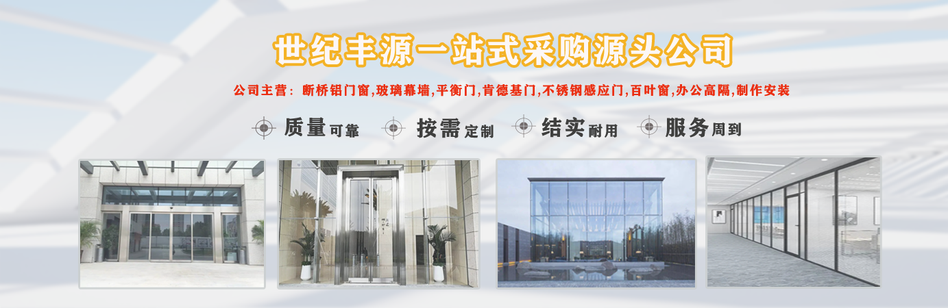 天津世紀豐源門窗有限公司從事斷橋鋁門窗,玻璃幕墻,平衡門,肯德基門,不銹鋼感應門,百葉窗,辦公高隔,制作安裝一站式訂制生產及配套服務等。  公司自成立以來,始終堅持以人才為本、誠信立業的經營原則,薈萃業界精英,成熟的技術、管理方法及企業經驗與國內企業的具體實際相結合,為企業供給各個方面的解決方案,使企業在激烈的市場競爭中始終堅持競爭力,實現企業快速、穩定地發展?! ≠|量好、服務好、才能信譽好,公司已在諸多領域取得輝煌成績,愿意成為您可信賴的長期合作伙伴?! ∽屛覀償y手同行,共同實現“讓普通老百姓都用得上高端門窗”...